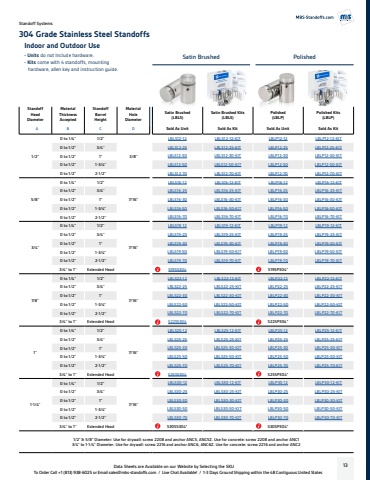 StandoffHeadDiameterMaterial Thickness AcceptedStandoffBarrelHeightMaterial Hole DiameterSatin Brushed(LBLS)Sold As UnitSatin Brushed Kits(LBLS)Sold As KitPolished(LBLP)Sold As UnitPolished Kits(LBLP)A B C D Sold As Kit1/2''0 to 1/4'' 1/2'' 3/8''LBLS12-12 LBLS12-12-KIT LBLP12-12 LBLP12-12-KIT0 to 1/2'' 3/4'' LBLS12-25 LBLS12-25-KIT LBLP12-25 LBLP12-25-KIT0 to 1/2'' 1'' LBLS12-30 LBLS12-30-KIT LBLP12-30 LBLP12-30-KIT0 to 1/2'' 1-3/4'' LBLS12-50 LBLS12-50-KIT LBLP12-50 LBLP12-50-KIT0 to 1/2'' 2-1/2'' LBLS12-70 LBLS12-70-KIT LBLP12-70 LBLP12-70-KIT5/8''0 to 1/4'' 1/2'' 7/16''LBLS16-12 LBLS16-12-KIT LBLP16-12 LBLP16-12-KIT0 to 1/2'' 3/4'' LBLS16-25 LBLS16-25-KIT LBLP16-25 LBLP16-25-KIT0 to 1/2'' 1'' LBLS16-30 LBLS16-30-KIT LBLP16-30 LBLP16-30-KIT0 to 1/2'' 1-3/4'' LBLS16-50 LBLS16-50-KIT LBLP16-50 LBLP16-50-KIT0 to 1/2'' 2-1/2'' LBLS16-70 LBLS16-70-KIT LBLP16-70 LBLP16-70-KIT3/4''0 to 1/4'' 1/2'' 7/16''LBLS19-12 LBLS19-12-KIT LBLP19-12 LBLP19-12-KIT0 to 1/2'' 3/4'' LBLS19-25 LBLS19-25-KIT LBLP19-25 LBLP19-25-KIT0 to 1/2'' 1'' LBLS19-30 LBLS19-30-KIT LBLP19-30 LBLP19-30-KIT0 to 1/2'' 1-3/4'' LBLS19-50 LBLS19-50-KIT LBLP19-50 LBLP19-50-KIT0 to 1/2'' 2-1/2'' LBLS19-70 LBLS19-70-KIT LBLP19-70 LBLP19-70-KIT3/4'' to 1'' Extended Head S19SS304 S19SP304*7/8''0 to 1/4'' 1/2'' 7/16''LBLS22-12 LBLS22-12-KIT LBLP22-12 LBLP22-12-KIT0 to 1/2'' 3/4'' LBLS22-25 LBLS22-25-KIT LBLP22-25 LBLP22-25-KIT0 to 1/2'' 1'' LBLS22-30 LBLS22-30-KIT LBLP22-30 LBLP22-30-KIT0 to 1/2'' 1-3/4'' LBLS22-50 LBLS22-50-KIT LBLP22-50 LBLP22-50-KIT0 to 1/2'' 2-1/2'' LBLS22-70 LBLS22-70-KIT LBLP22-70 LBLP22-70-KIT3/4'' to 1'' Extended Head S22SS304 S22SP304*1''0 to 1/4'' 1/2'' 7/16''LBLS25-12 LBLS25-12-KIT LBLP25-12 LBLP25-12-KIT0 to 1/2'' 3/4'' LBLS25-25 LBLS25-25-KIT LBLP25-25 LBLP25-25-KIT0 to 1/2'' 1'' LBLS25-30 LBLS25-30-KIT LBLP25-30 LBLP25-30-KIT0 to 1/2'' 1-3/4'' LBLS25-50 LBLS25-50-KIT LBLP25-50 LBLP25-50-KIT0 to 1/2'' 2-1/2'' LBLS25-70 LBLS25-70-KIT LBLP25-70 LBLP25-70-KIT3/4'' to 1'' Extended Head S25SS304 S25SP304*1-1/4''0 to 1/4'' 1/2'' 7/16''LBLS30-12 LBLS30-12-KIT LBLP30-12 LBLP30-12-KIT0 to 1/2'' 3/4'' LBLS30-25 LBLS30-25-KIT LBLP30-25 LBLP30-25-KIT0 to 1/2'' 1'' LBLS30-30 LBLS30-30-KIT LBLP30-30 LBLP30-30-KIT0 to 1/2'' 1-3/4'' LBLS30-50 LBLS30-50-KIT LBLP30-50 LBLP30-50-KIT0 to 1/2'' 2-1/2'' LBLS30-70 LBLS30-70-KIT LBLP30-70 LBLP30-70-KIT3/4'' to 1'' Extended Head S30SS304* S30SP304*1/2\8 and anchor ANC13/4\2216 and anchor ANC2Data Sheets are Available on our Website by Selecting the SKUTo Order Call +1 (813) 938-6025 or Email sales@mbs-standoffs.com / Live Chat Available! / 1-3 Days Ground Shipping within the 48 Contiguous United States13Standoff Systems304 Grade Stainless Steel StandoffsIndoor and Outdoor Use- Units do not Include hardware.- Kits come with 4 standoffs, mounting hardware, allen key and instruction guide.Satin Brushed Polished