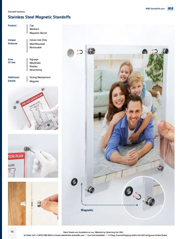 16 Data Sheets are Available on our Website by Selecting the SKUTo Order Call +1 (813) 938-6025 or Email sales@mbs-standoffs.com / Live Chat Available! / 1-3 Days Ground Shipping within the 48 Contiguous United StatesMagneticStandoff SystemsStainless Steel Magnetic StandoffsProduct CapWashersMagnetic BarrelUnique FeaturesIndoor Use OnlyWall MountedRemovableArea Of UseSignageWayfinderDisplayAdvertisingAdditionalDetailsStrong NeodymiumMagnets