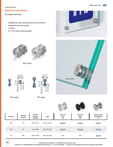 166 Data Sheets are Available on our Website by Selecting the SKUTo Order Call +1 (813) 938-6025 or Email sales@mbs-standoffs.com / Live Chat Available! / 1-3 Days Ground Shipping within the 48 Contiguous United StatesDiameter Mounting DiameterMaterialThicknessAcceptedHeadAluminum Clear(A)Aluminum Black(B)Stainless Steel Satin Brushed(S)3/8'' 1/4'' 5/16'' to 1/2'' Flat 1/4'' Thick. MC038A MC038B MC038S3/8'' 1/4'' 1/4'' to 3/8'' Flat 1/16'' Thick. MCS038A MCS038B MCS038S1/2'' 3/8'' 3/16'' to 5/16'' Flat 1/16'' Thick. N/A N/A 100.020Mbs StandoffsThis document and the product mentioned in Reference are the exclusive property of MBS-Standoffs, they can not be used, reproduced, disclosed or disclosed without prior authorizationN%u00b0 Plan : PS370Scale : 1:4Sizes : Miminum 5/16\ 7.3mm3/8\10mm1/4\ 6.4mmMbs StandoffsThis document and the product mentioned in Reference are the exclusive property of MBS-Standoffs, they can not be used, reproduced, disclosed or disclosed without prior authorizationN%u00b0 Plan : PS370Scale : 1:4Sizes : Minimum 1/4\ 6mm3/8\10mm1/16\ 2mmSKU: MCS038 SKU: MC038SKU: 100.020%u2022 Designed from high quality stainless steel and aluminum%u2022 Designed for flat material signs%u2022 3 Finishes%u2022 1/4'' To 1/2'' thick, material acceptedSKU: MCS038SProjecting SystemsMaterial ConnectorsFor Indoor Use Only