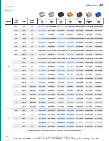 Diameter Barrel Height Thread Tapped LengthAluminum Clear(A)AluminumShiny(AS)AluminumBlack(B)AluminumGold(G)AluminumBronze(AB)AluminumChampagne(BR)AluminumBlue(BL)3/4''1/4'' #10-24 Thru S075-025-1024A S075-025-1024AS* S075-025-1024B S075-025-1024G* S075-025-1024AB* S075-025-1024BR* S075-025-1024BL*1/4'' 1/4-20 Thru S075-02525A S075-02525AS* S075-02525B* S075-02525G* S075-02525AB* S075-02525BR* S075-02525BL*1/4'' 5/16-18 Thru S075-025A S075-025AS* S075-025B* S075-025G* S075-025AB* S075-025BR* S075-025BL*1/2'' #10-24 Thru S075-050-1024A S075-050-1024AS* S075-050-1024B S075-050-1024G* S075-050-1024AB* S075-050-1024BR* S075-050-1024BL*1/2'' 1/4-20 Thru S075-05025A S075-05025AS* S075-05025B S075-05025G S075-05025AB* S075-05025BR* S075-05025BL*1/2'' 5/16-18 Thru S075-050A S075-050AS* S075-050B S075-050G S075-050AB* S075-050BR* S075-050BL*3/4'' #10-24 Thru S075-075-10024A* S075-075-10024AS* S075-075-10024B* S075-075-10024G* S075-075-10024AB* S075-075-10024BR* S075-075-10024BL*3/4'' 5/16-18 Thru S075-075A S075-075AS* S075-075B S075-075G S075-075AB* S075-075BR* S075-075BL*1'' #10-24 Thru S075-100-10024A* S075-100-10024AS* S075-100-10024B* S075-100-10024G* S075-100-10024AB* S075-100-10024BR* S075-100-10024BL*1'' 1/4-20 Thru S075-10025A S075-10025AS* S075-10025B S075-10025G S075-10025AB* S075-10025BR* S075-10025BL*1'' 5/16-18 Thru S075-100A S075-100AS* S075-100B S075-100G S075-100AB* S075-100BR* S075-100BL*1-1/2'' 1/4-20 Thru S075-15025A S075-15025AS* S075-15025B S075-15025G S075-15025AB* S075-15025BR* S075-15025BL*1-1/2'' 5/16-18 Thru S075-150A S075-150AS* S075-150B S075-150G S075-150AB* S075-150BR* S075-150BL*2'' 1/4-20 Thru S075-20025A S075-20025AS* S075-20025B S075-20025G S075-20025AB* S075-20025BR* S075-20025BL*2'' 5/16-18 Thru S075-200A S075-200AS* S075-200B S075-200G S075-200AB* S075-200BR* S075-200BL*2-1/2'' 5/16-18 1'' Both Ends S075-250A* S075-250AS* S075-250B* S075-250G* S075-250AB* S075-250BR* S075-250BL*2-3/4'' 5/16-18 1'' Both Ends S075-275A* S075-275AS* S075-275B* S075-275G* S075-275AB* S075-275BR* S075-275BL*3'' 1/4-20 1'' Both Ends S075-30025A S075-30025AS* S075-30025B S075-30025G S075-30025AB* S075-30025BR* S075-30025BL*3'' 5/16-18 1'' Both Ends S075-300A S075-300AS* S075-300B S075-300G S075-300AB* S075-300BR* S075-300BL*3-1/4'' 5/16-18 1'' Both Ends S075-325A* S075-325AS* S075-325B* S075-325G* S075-325AB* S075-325BR* S075-325BL*4'' 5/16-18 1'' Both Ends S075-400A S075-400AS* S075-400B* S075-400G* S075-400AB* S075-400BR* S075-400BL*7/8''1/2'' 1/4-20 Thru S078-05025A S078-05025AS* S078-05025B S078-05025G S078-05025AB* S078-05025BR* S078-05025BL*1'' 1/4-20 Thru S078-10025A S078-10025AS* S078-10025B S078-10025G S078-10025AB* S078-10025BR* S078-10025BL*1-1/2'' 1/4-20 Thru S078-15025A S078-15025AS* S078-15025B S078-15025G S078-15025AB* S078-15025BR* S078-15025BL*2'' 1/4-20 Thru S078-20025A S078-20025AS* S078-20025B S078-20025G S078-20025AB* S078-20025BR* S078-20025BL*3'' 1/4-20 Thru S078-30025A S078-30025AS* S078-30025B S078-30025G S078-30025AB* S078-30025BR* S078-30025BL** Available upon request minimum order quantity 100 / * More sizes available on mbs-standoffs.com92 Data Sheets are Available on our Website by Selecting the SKUTo Order Call +1 (813) 938-6025 or Email sales@mbs-standoffs.com / Live Chat Available! / 1-3 Days Ground Shipping within the 48 Contiguous United StatesCaps and BarrelsBarrels